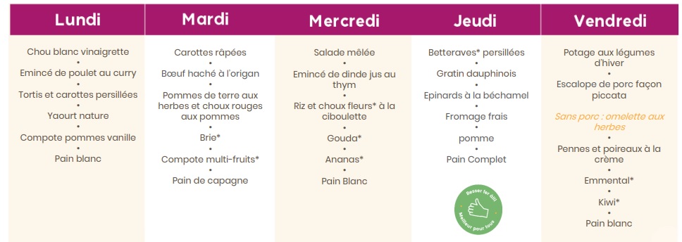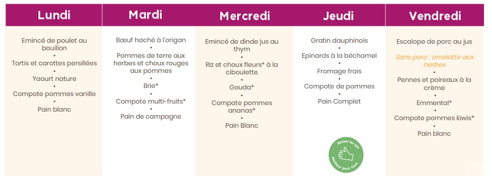 Les menus sont élaborés par une diététicienne dans le respect des recommandations du GEMRCN.